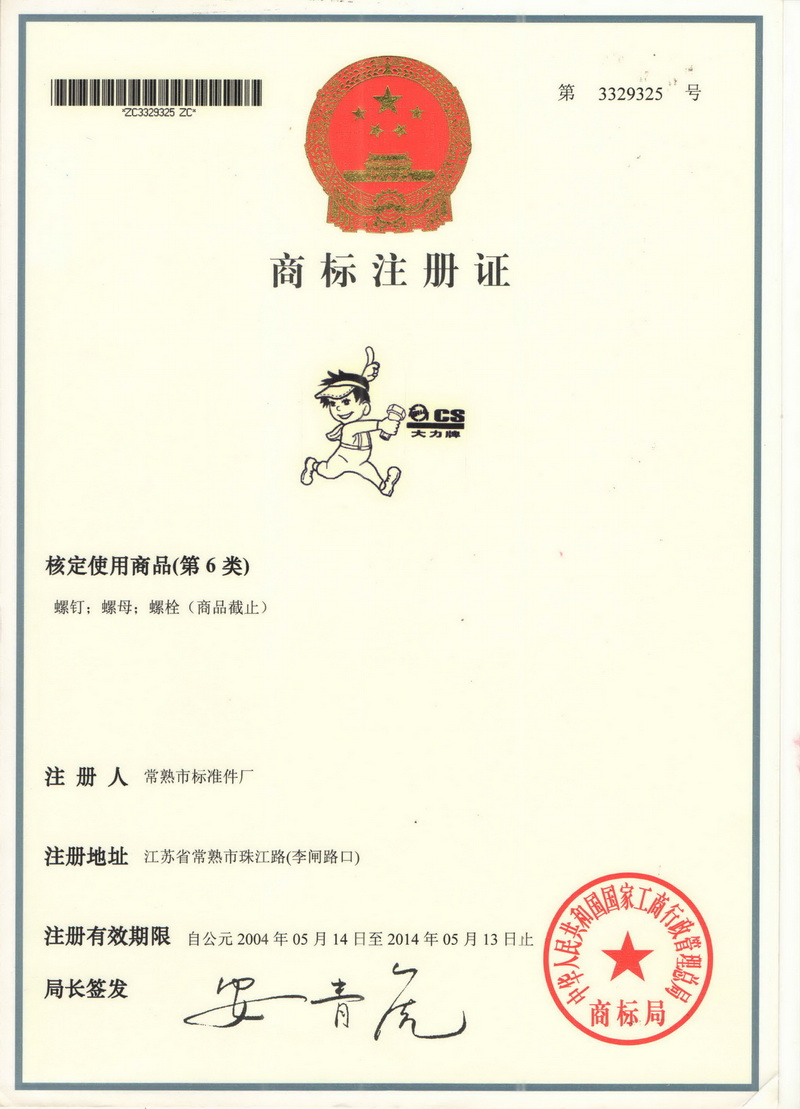 注冊人變更為常熟市標準件廠有限公司,注冊人地址:常熟市通港路358號。