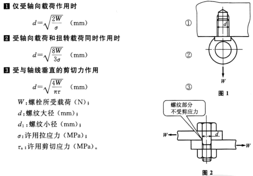 三角形螺紋適合做連接螺紋使用,方螺紋適合做受較大載荷作用的傳動螺紋使用。螺栓受剪切力作用時,螺紋部分所受的剪切力作用在螺紋小徑上。計算時,螺紋的小徑d1可按0.8倍的螺紋大徑d計算,即d1=0.8d。