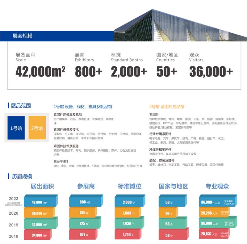 本屆展會規(guī)模:4.2萬㎡展出面積,800+參展企業(yè),2000+標(biāo)準(zhǔn)攤位,3.8萬余名專業(yè)觀眾。1號館:上游設(shè)備、線材、模具及耗品。2號館:緊固件成品。