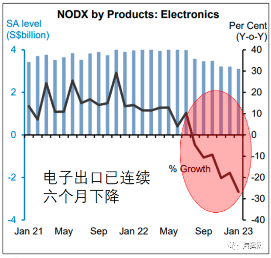 非石油國內(nèi)出口NODX當(dāng)中,電子類和非電子類雙雙萎縮。其中,電子業(yè)出口跌幅從去2022年12月17.9%擴(kuò)大至26.8%(已連續(xù)六個月萎縮);非電子業(yè)出口的年比跌幅從21.3%擴(kuò)大至24.5%。與此可看,新加坡跟香港一樣,外貿(mào)數(shù)據(jù)并不好看,全方位萎縮惡化。(新加坡出口數(shù)據(jù))