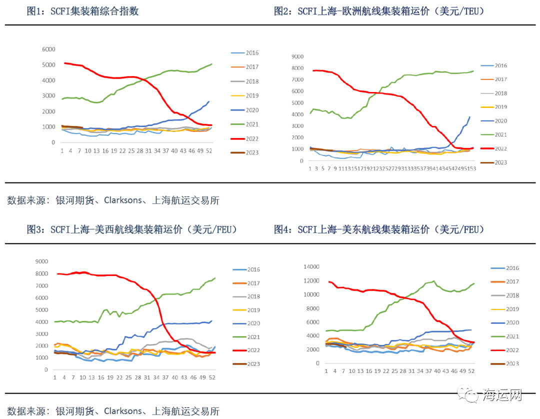 國內(nèi)也經(jīng)歷外貿(mào)出口下滑,中小外貿(mào)企業(yè)訂單減少的情況。一箱難求的火熱市場已成為歷史,取而代之的是港口空箱堆積如山,運(yùn)價一跌再跌,船公司運(yùn)力過剩大面積停航。運(yùn)價方面:2月集裝箱運(yùn)價延續(xù)下跌,節(jié)后淡季集裝箱運(yùn)輸市場供需格局繼續(xù)走弱。具體來看,截至2月24日當(dāng)周,上海出口集裝箱運(yùn)價指數(shù)SCFI報946.68點,環(huán)比-2.9%,同比-80.4%。其中上海-美西線運(yùn)價報1234美元/FEU,環(huán)比-3.1%,同比-84.7%;上海-歐洲航線運(yùn)價報882美元/TEU,環(huán)比-3.1%,同比-88.3%。整體來看,春節(jié)過后集裝箱航運(yùn)市場表現(xiàn)平淡,集裝箱運(yùn)輸供需格局延續(xù)寬松。