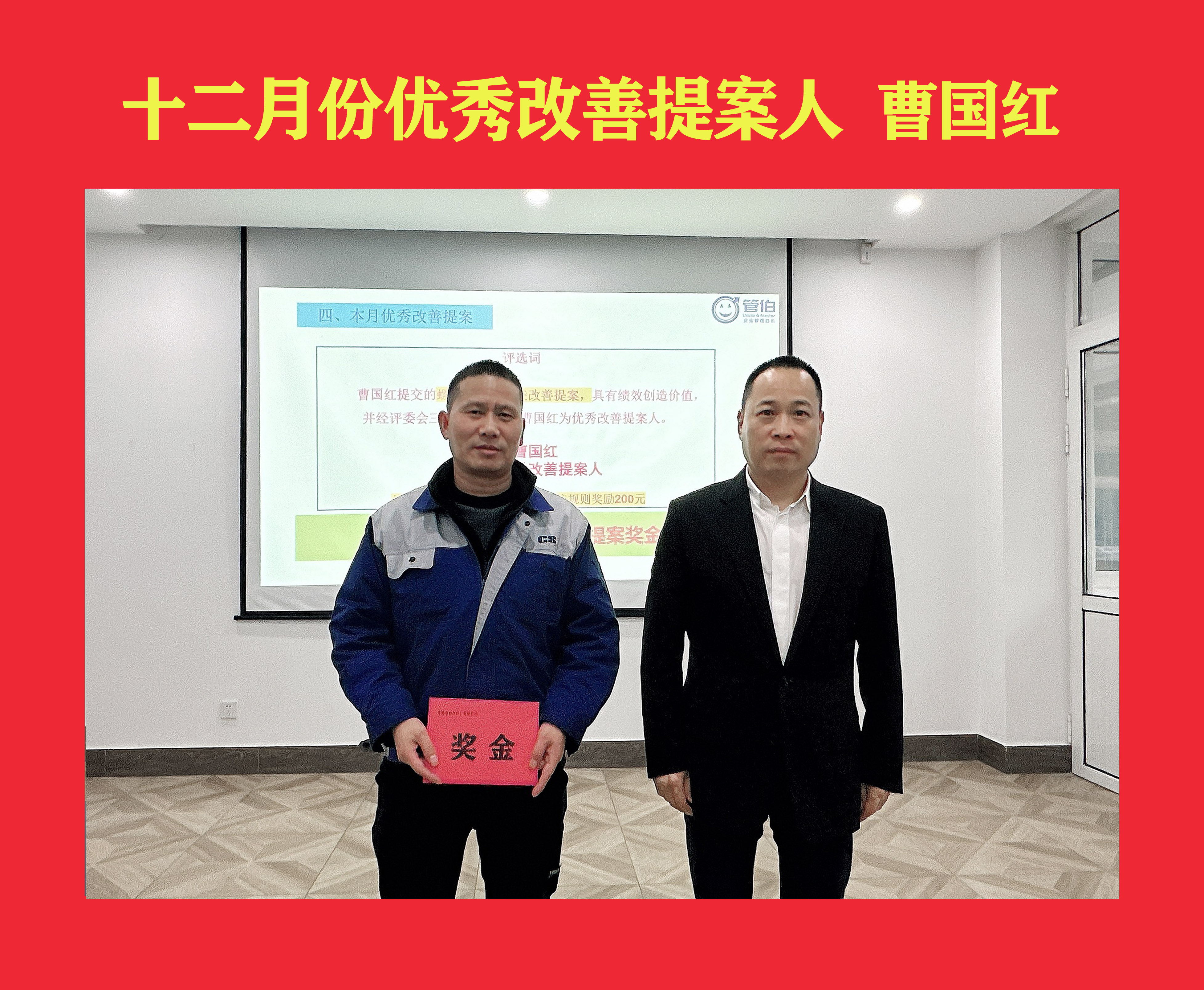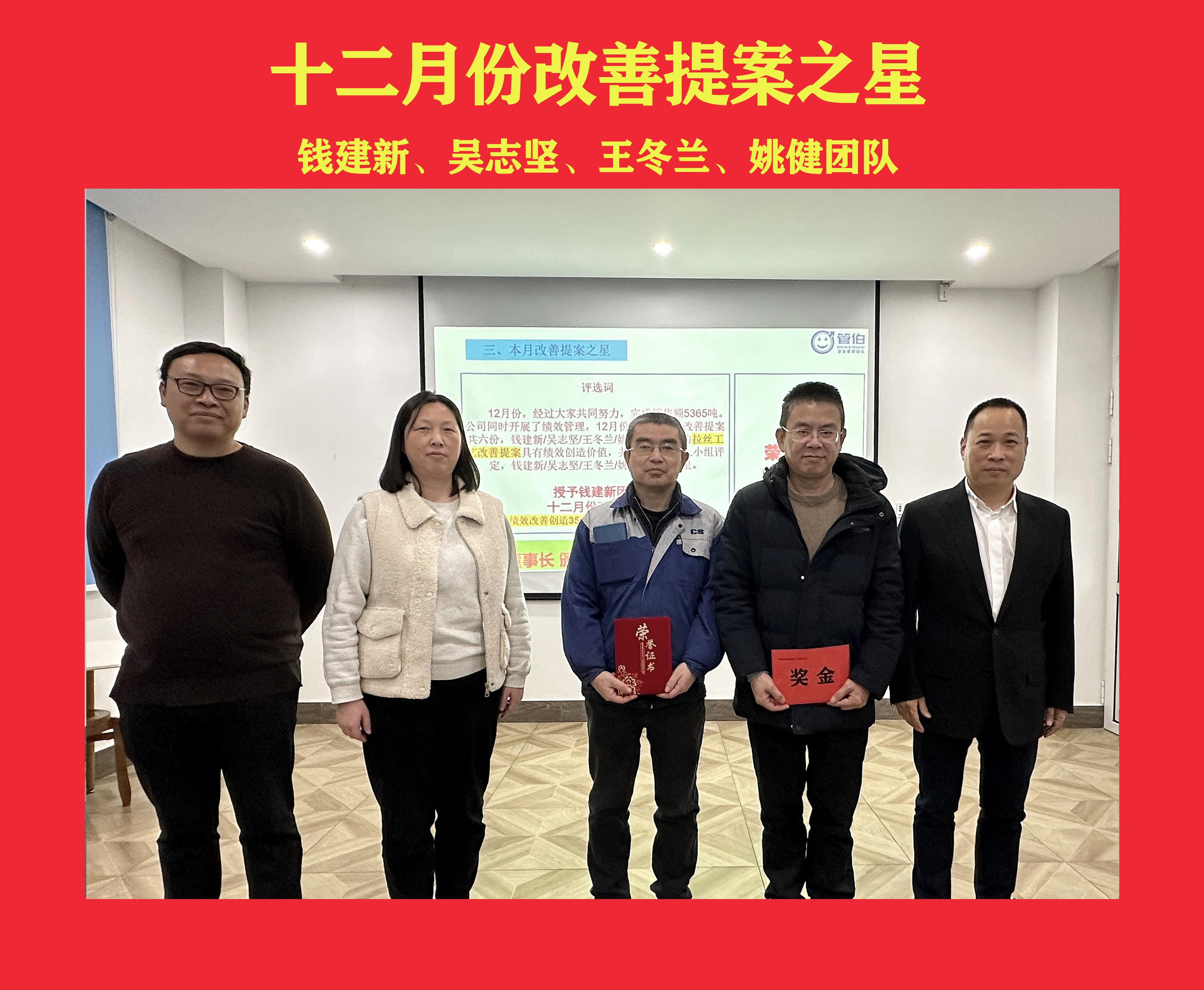 本次會議公布了12月份公司績效完成情況、副總級&經(jīng)理級人員的績效得分、12月份績效改善提案情況。經(jīng)評定, 錢建新、吳志堅(jiān)、王冬蘭、姚健團(tuán)隊(duì)獲得“十二月份改善提案之星”, 曹國紅、吳明剛獲得“12月份優(yōu)秀改善提案人” 榮譽(yù)稱號。